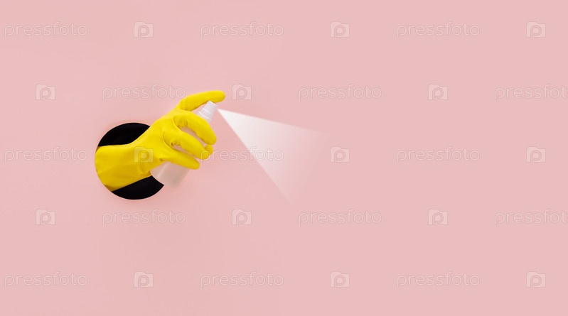 Рука разбрызгивает антибактериальный спрей на розовом фоне. Баннер. Профилактика коронавируса, ковид-19. Руки в отверстие для бумаги. Концепция здравоохранения