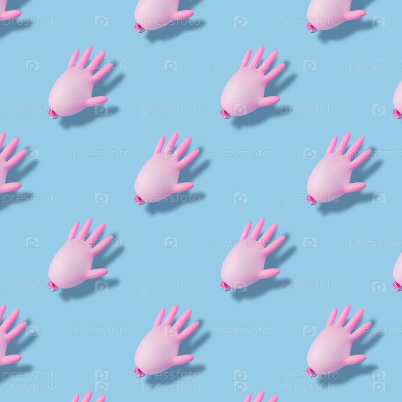 Бесшовный рисунок с надутыми розовыми медицинскими перчатками на синем фоне. Профилактика и защита от коронавируса, ковид-19. Концепция здравоохранения