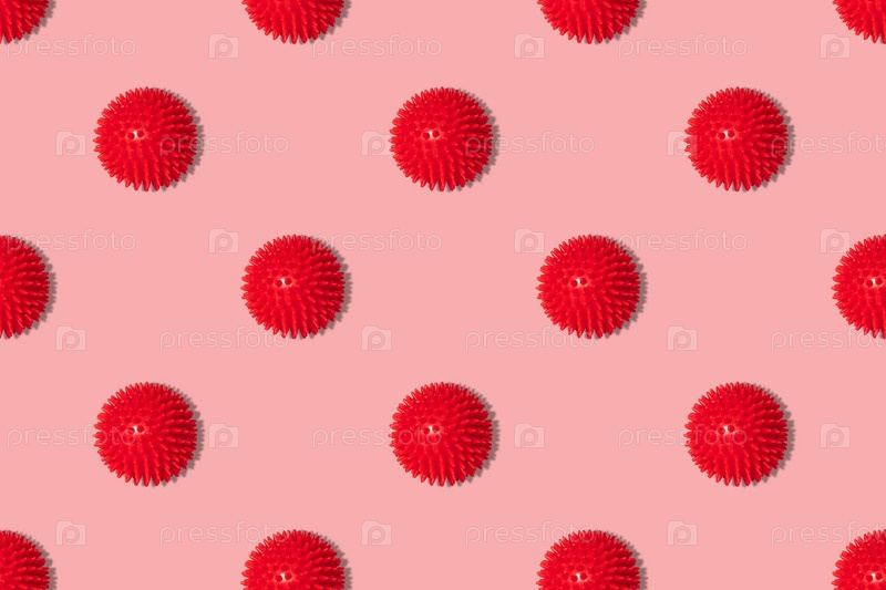 Бесшовный рисунок с красными молекулами коронавируса на розовом фоне. Ковид-19, концепция здравоохранения