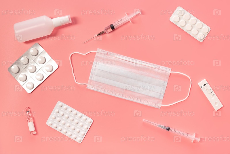 Медицинская аптечка. Шприц, маска, таблетки и дезинфицирующее средство, тест на розовом фоне. Средства для профилактики и лечения коронавируса