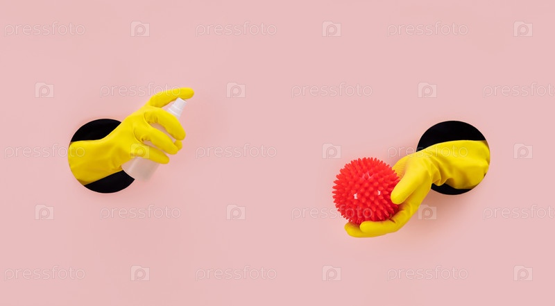 Рука в защитной желтой перчатке брызгает на вирус антибактериальным спреем. Дезинфекция и защита от коронавируса, ковид-19. Руки в отверстие для бумаги