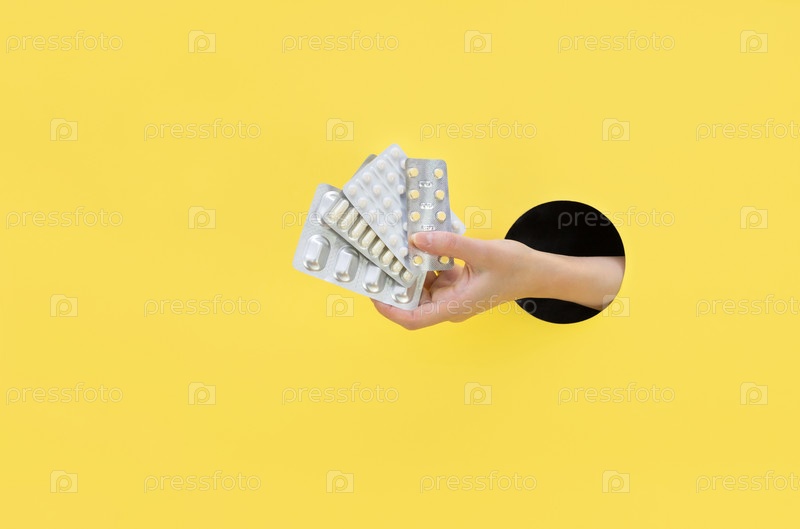 Женская рука держит волдырь с таблетками на желтом фоне. Рука в отверстие для бумаги. Концепция здравоохранения
