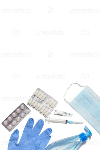 Перчатки, шприц, маска, таблетки и дезинфицирующее средство на белом фоне. Средства для профилактики и лечения коронавируса. Ковид-19, концепция здравоохранения