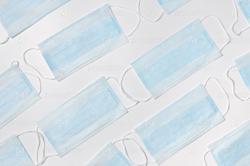 Медицинские маски на белом фоне. Образец защитной маски. Защита и профилактика от коронавируса, ковид-19 и других вирусов. Плоская планировка, вид сверху