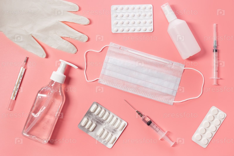 Средства для профилактики и лечения коронавируса. Перчатки, шприц, маска, таблетки и дезинфицирующее средство, термометр на розовом фоне. Концепция здравоохранения