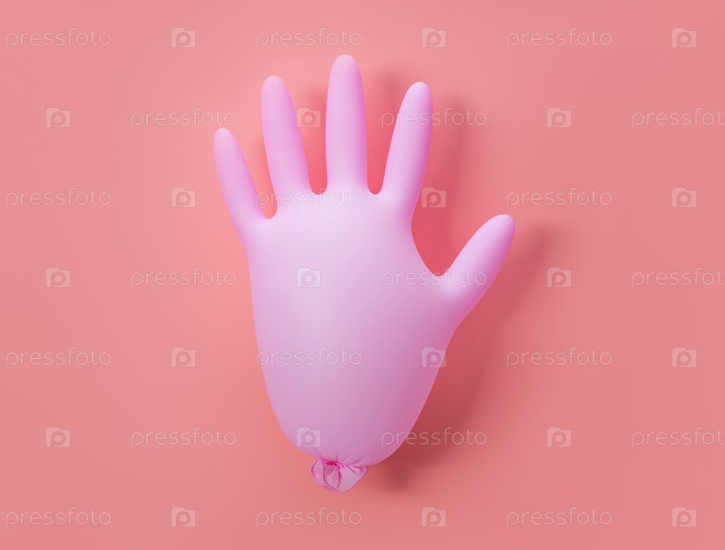 Медицинская розовая надутая перчатка на розовом фоне. Защита от ковид-19, коронавируса. Концепция здравоохранения