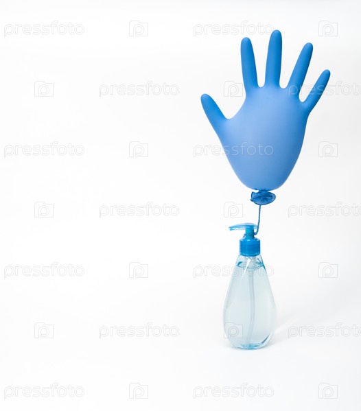 Дезинфицирующее средство в синей бутылке на белом фоне Антисептик с раздутой медицинской перчаткой Концепция защиты от коронавируса, covid-19