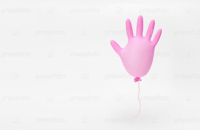 Розовая летающая хирургическая перчатка на белом фоне. Минимальная концепция. Защита и профилактика от коронавируса
