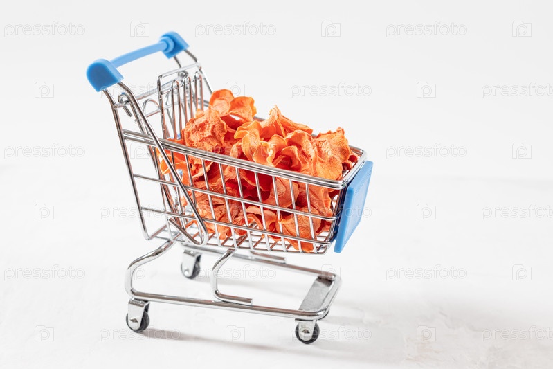Сушеные морковные чипсы в игрушечной продуктовой тележке на белом фоне. Органическая натуральная пища. Концепция веганского шоппинга