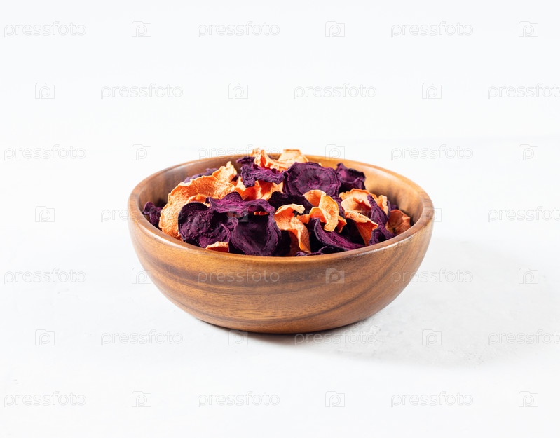 Сушеные морковные и свекольные чипсы в деревянной миске на белом бетонном фоне. Органическая натуральная пища
