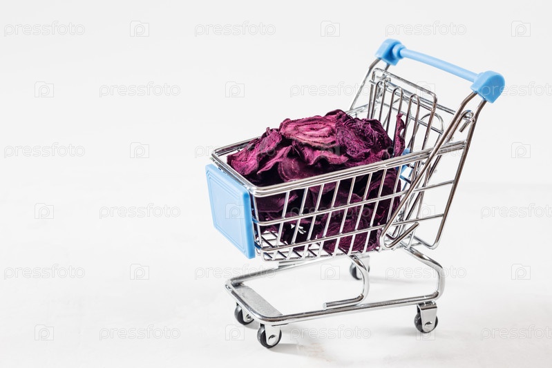 Сушеные свекольные чипсы в игрушечной продуктовой тележке на белом фоне. Органическая натуральная пища. Концепция веганского шоппинга