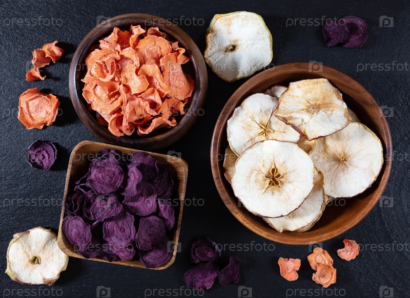 Сушеная морковь, свекла и яблочные чипсы в деревянной миске на фоне черного камня. Органическая натуральная пища