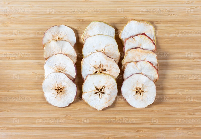 Сушеные яблочные чипсы на разделочной доске. Натуральная органическая пища