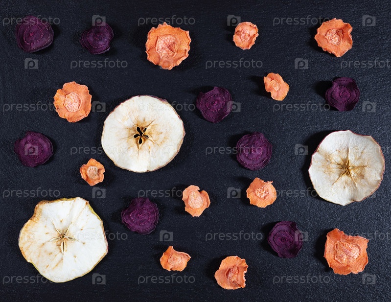 Сушеная морковь, свекла и яблочные чипсы на фоне черного камня. Органическая натуральная пища