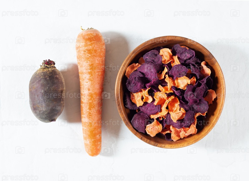 Сушеные морковные и свекольные чипсы в деревянной миске и сырая морковь, свекла на белом бетонном фоне. Органическая натуральная пища