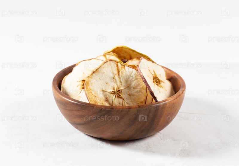 Сушеные яблочные чипсы в деревянной миске на белом бетонном фоне. Натуральная органическая пища