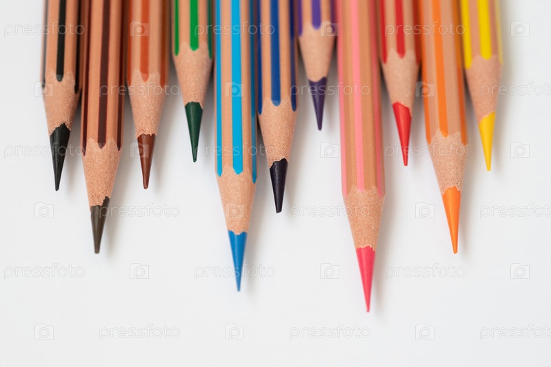 Цветные карандаши на белом фоне крупным планом. Выборочный фокус