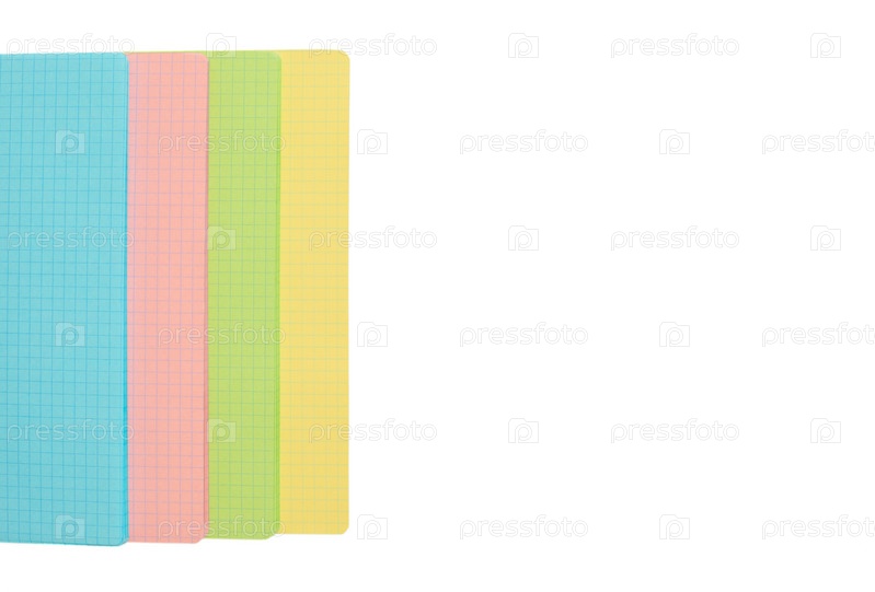 Цветные клетчатые листы, изолированные на белом фоне. Разноцветные листы блокнота. Макет или шаблон. Скопируйте пространство, вид сверху, плоская планировка