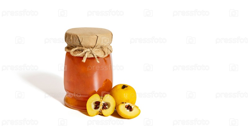 Джем из айвы, изолированные на белом фоне. Банка варенья и кусочки айвы. Скопируйте пространство