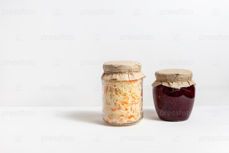 Домашняя квашеная капуста с морковью и капустным салатом со свеклой в стеклянной банке на белом деревянном фоне. Ферментированная пища