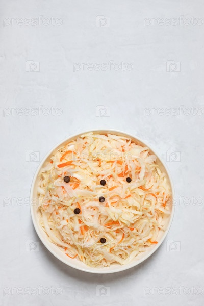 Домашняя квашеная капуста. Ферментированная пища. Квашеная капуста с морковью в миске на бетонном белом фоне