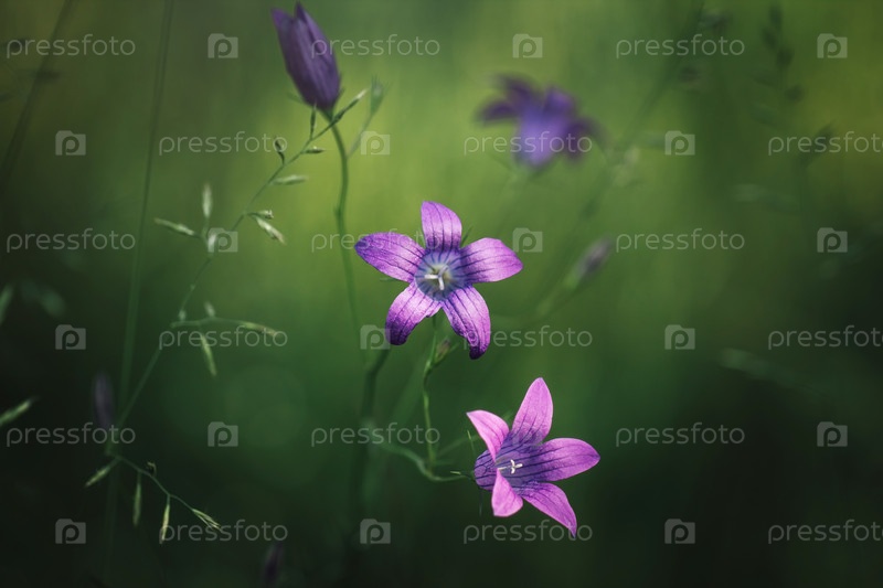 Природный фон поля. Campanula patula, колокольчик, колокол в поле. Красивый летний луг на заднем плане. Летние полевые цветы в солнечный день