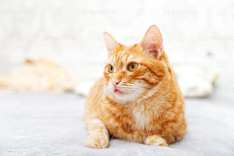 Рыжий кот лежит на кровати с высунутым кончиком языка