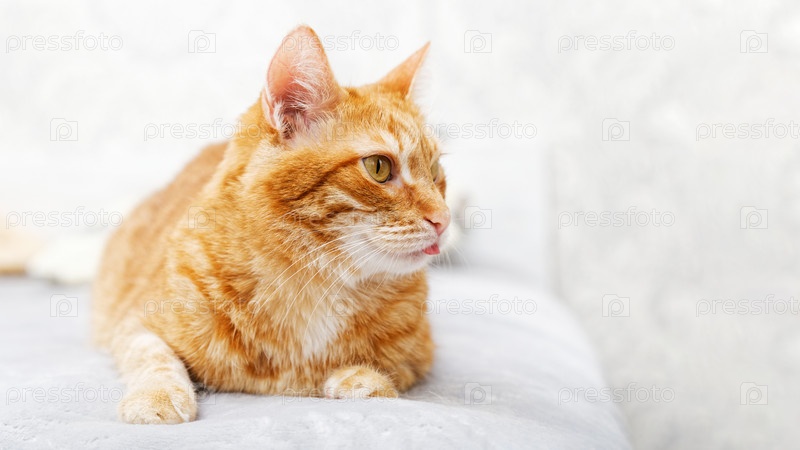 Рыжий кот лежит на кровати, высунув кончик языка. Мелкий фокус. Копипространство
