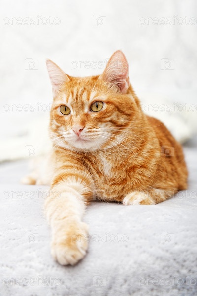 Крупным планом портрет рыжего кота, лежащего на кровати и смотрящего прямо вперед на белом размытом фоне. Мелкий фокус