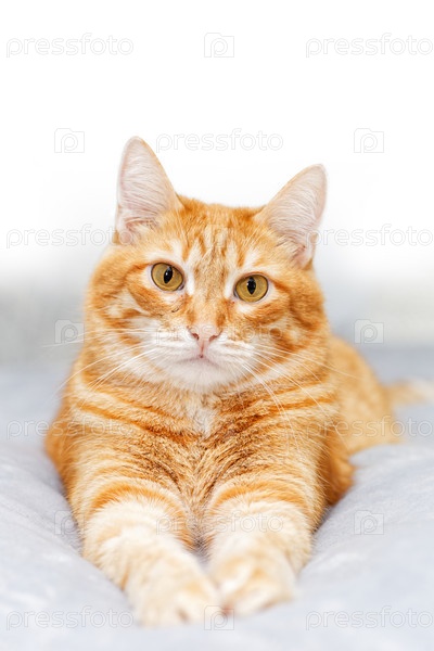 Крупным планом портрет рыжего кота, лежащего на кровати