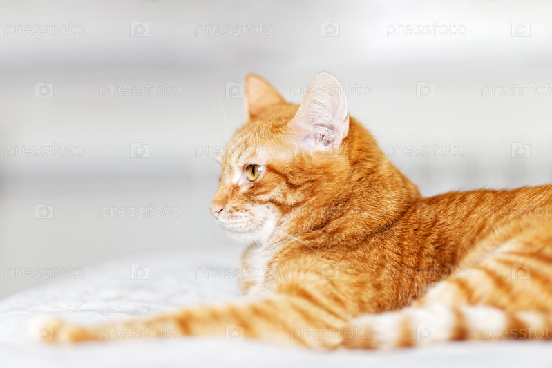 Крупным планом портрет рыжего кота, лежащего на кровати