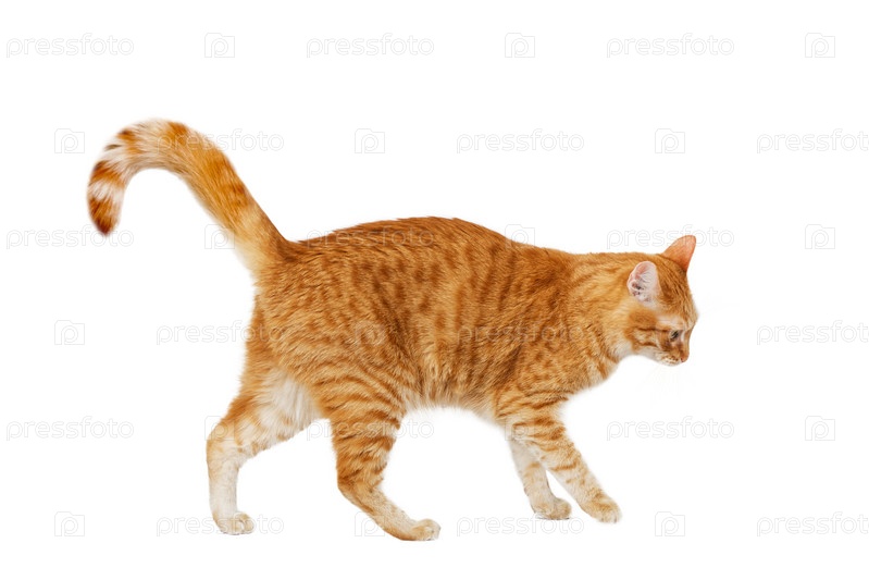 Ходячий рыжий кот смотрит перед собой. Изолированные на белом фоне