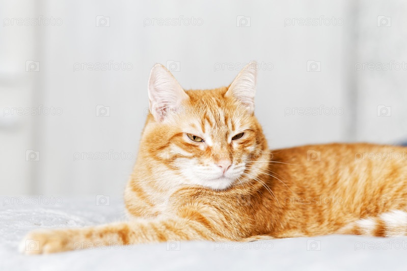 Крупным планом портрет рыжего кота, лежащего на кровати