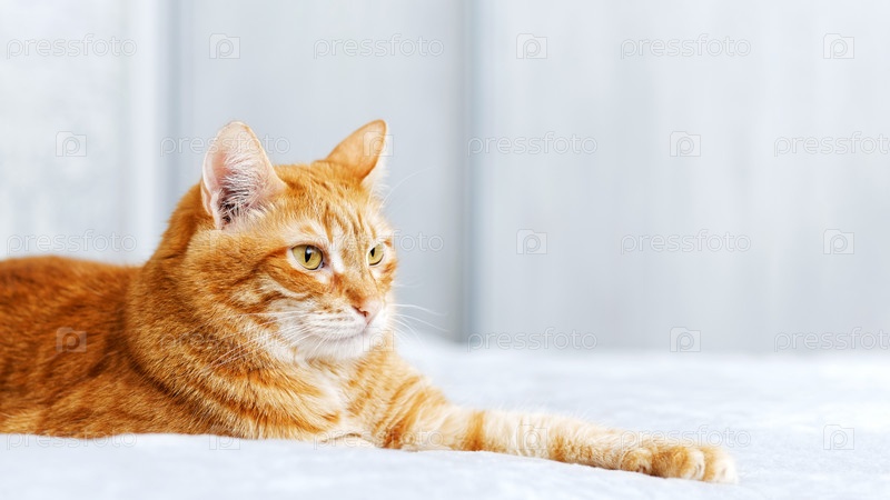 Крупным планом портрет рыжего кота, лежащего на кровати и отводящего взгляд на сером фоне. Мелкий фокус. Копипространство