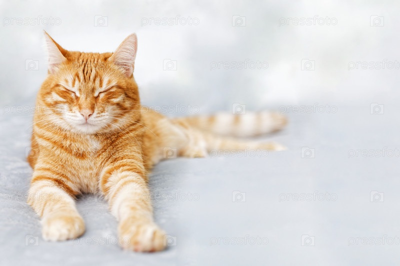 Рыжий кот лежит на кровати с закрытыми глазами и дремлет. Мелкий фокус. Копипространство