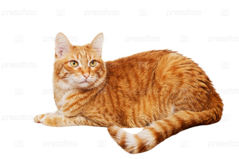 Портрет лежащего рыжего кота, изолированного на белом