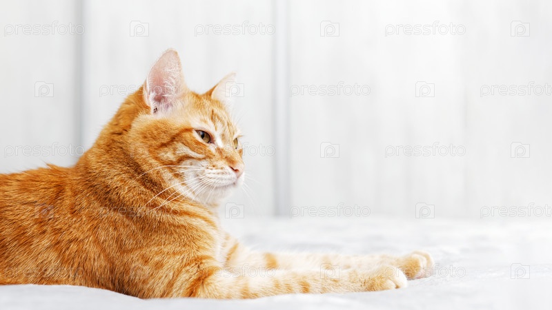 Крупным планом портрет рыжего кота, лежащего на кровати и отводящего взгляд на размытом сером фоне. Мелкий фокус. Копипространство