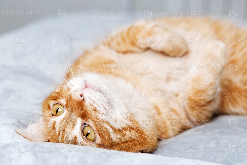 Рыжий кот лежит на кровати на спине, сложив передние лапы на груди. Мелкий фокус
