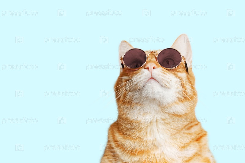 Крупным планом портрет забавного рыжего кота в солнечных очках и смотрящего вверх, изолированного на светло-голубом. Копипространство