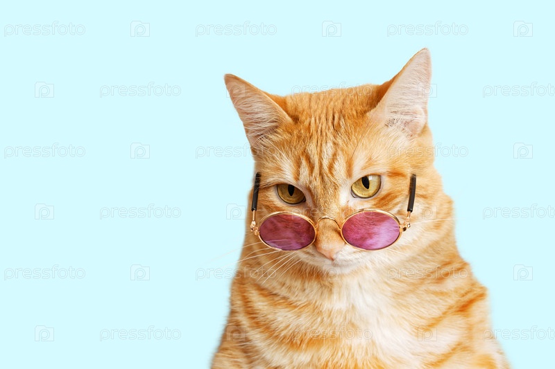 Портрет крупным планом смешного рыжего кота в солнечных очках, изолированных на светло-голубом. Копипространство
