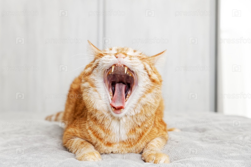 Крупным планом портрет зевающего рыжего кота, лежащего на кровати на белом размытом фоне. Мелкий фокус