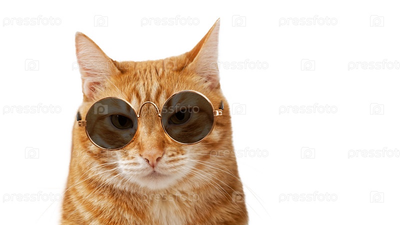 Портрет крупным планом смешного рыжего кота в солнечных очках, изолированных на белом. Мелкий фокус. Копипространство