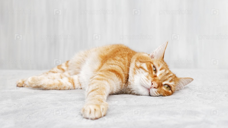 Портрет рыжего кота, лежащего на кровати. Мелкий фокус. Копипространство