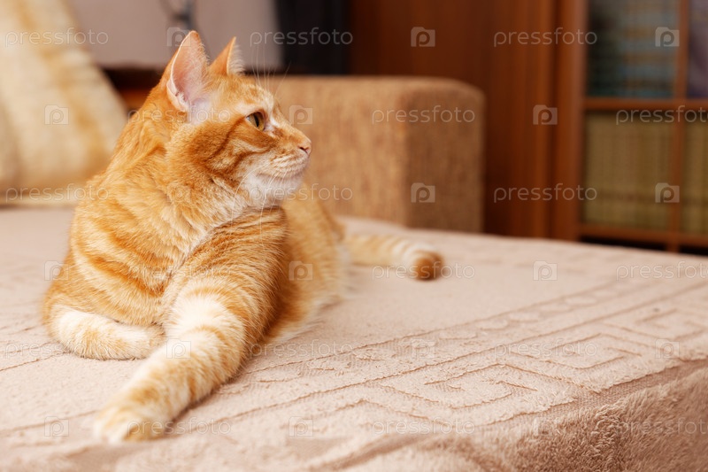 Портрет рыжей домашней кошки, лежащей на диване. Мелкий фокус. Копипространство
