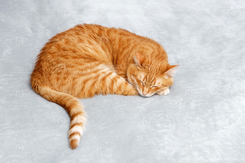 Рыжий кот лежит на кровати и спит. Мелкий фокус