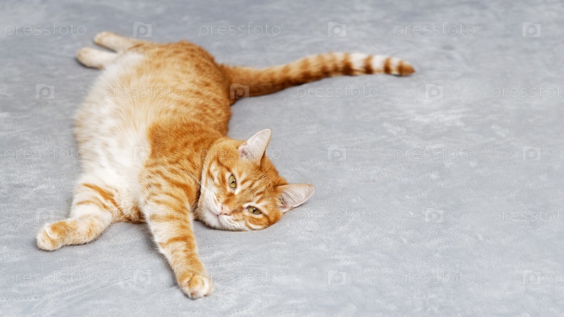 Портрет рыжего кота, лежащего на кровати с вытянутыми лапами. Мелкий фокус. Копипространство