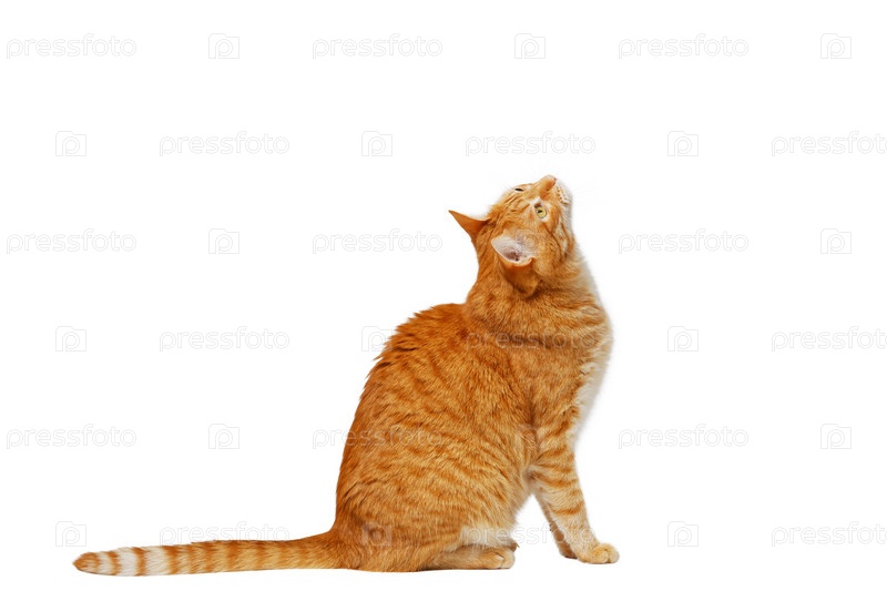 Рыжий кот сидит и внимательно смотрит вверх. Изолированные на белом фоне