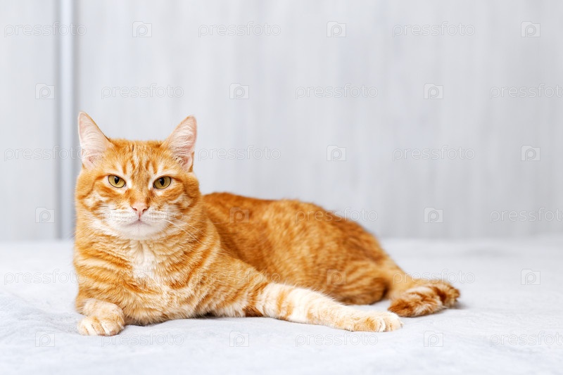 Портрет рыжего кота, лежащего на кровати и смотрящего прямо в камеру на размытом фоне. Мелкий фокус. Копипространство