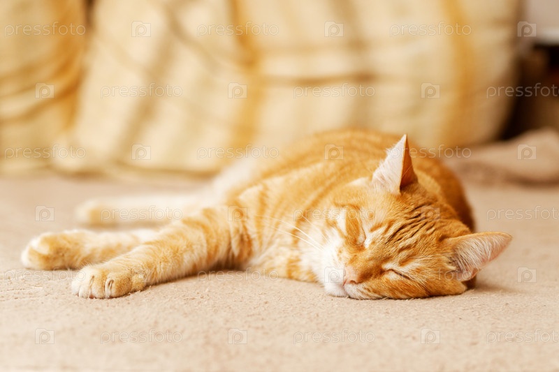 Портрет рыжего кота лежит на диване и спит. Мелкий фокус