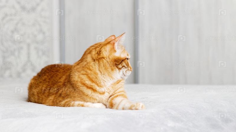 Рыжий кот лежит на кровати и смотрит в сторону на размытом сером фоне. Мелкий фокус. Копипространство